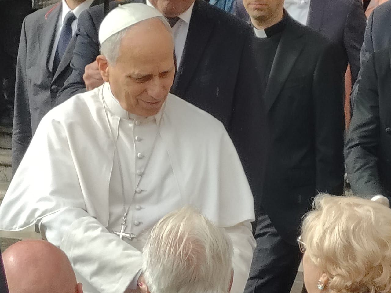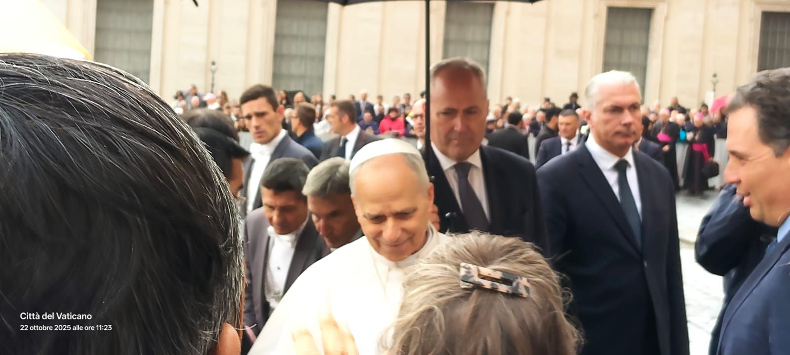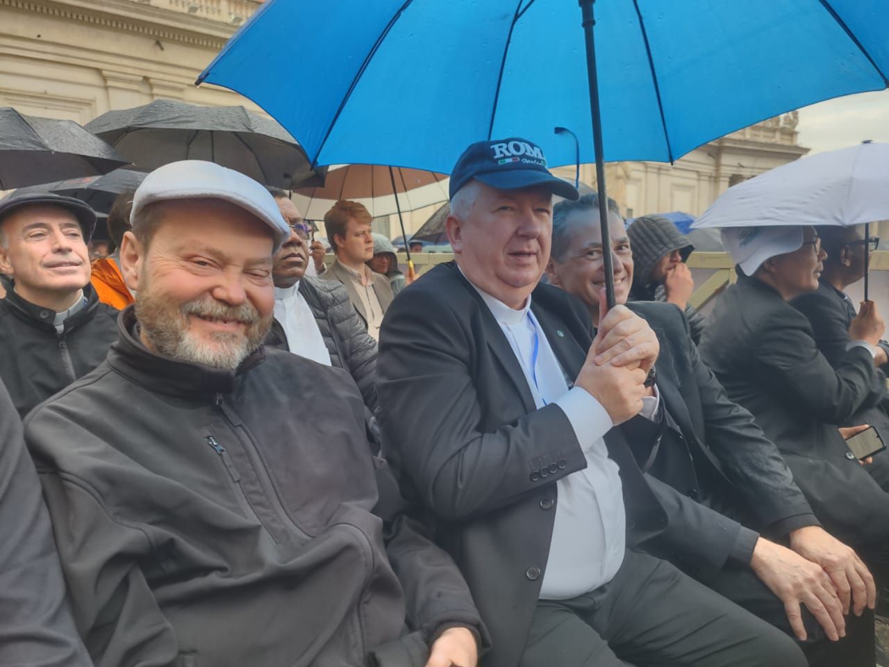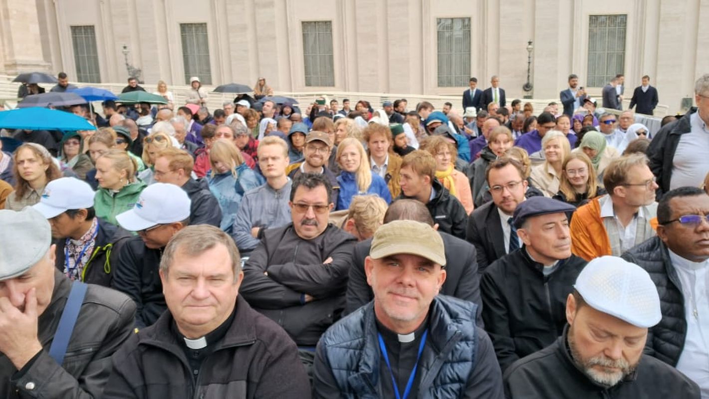 Oggi era la giornata per l’udienza con il Santo Padre Leone XIV. Dopo la prima collazione alle ore 07.00 siamo partiti con pullman al Vaticano. La fila già era lunga ma scorreva bene. Dopo il controllo di sicurezza siamo andati al lato destro accanto al podio della Sua Santità. Verso le 10.00 il Santo Padre è arrivato sulla piazza con il papa mobile per un giro a salutare i fedeli, dopodiché il Papa ha iniziato l’udienza con il segno della croce seguito dal suo discorso sulla risurrezione di Cristo come sorgente della nostra gioia e speranza che dirige verso la vita eterna. Dopo la benedizione, la Sua Santità ha salutato i cardinali, i vescovi e i fedeli attorno al podio. Noi anche, i capitolari, abbiamo avuto un’occasione di salutarlo e abbiamo fatto la foto insieme davanti alla Basica di San Pietro. Nonostante la pioggia siamo rimasti lì fino alla fine. Abbiamo ricevuto un regalo dal Santo Padre, i rosari per i capitolari.